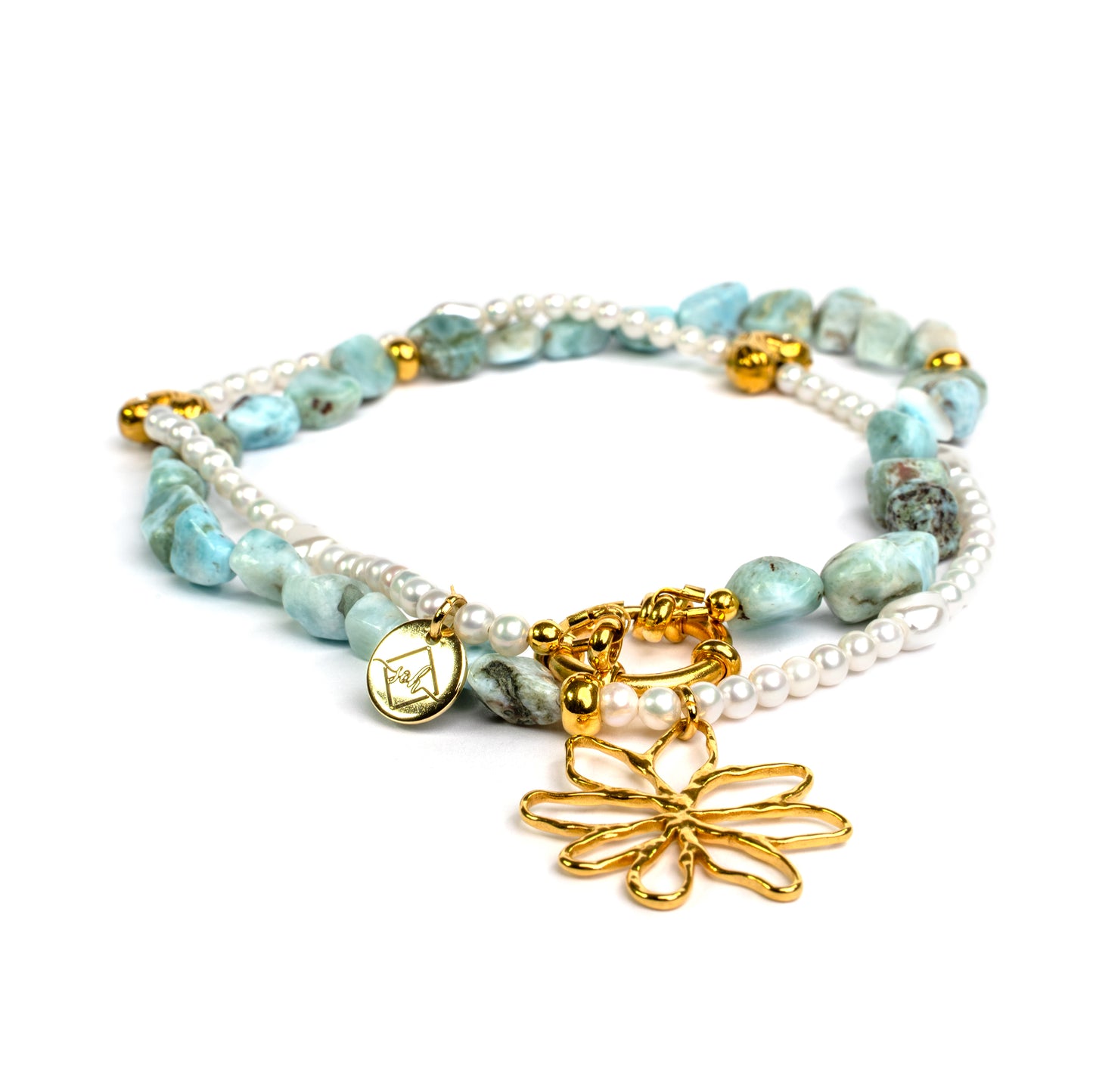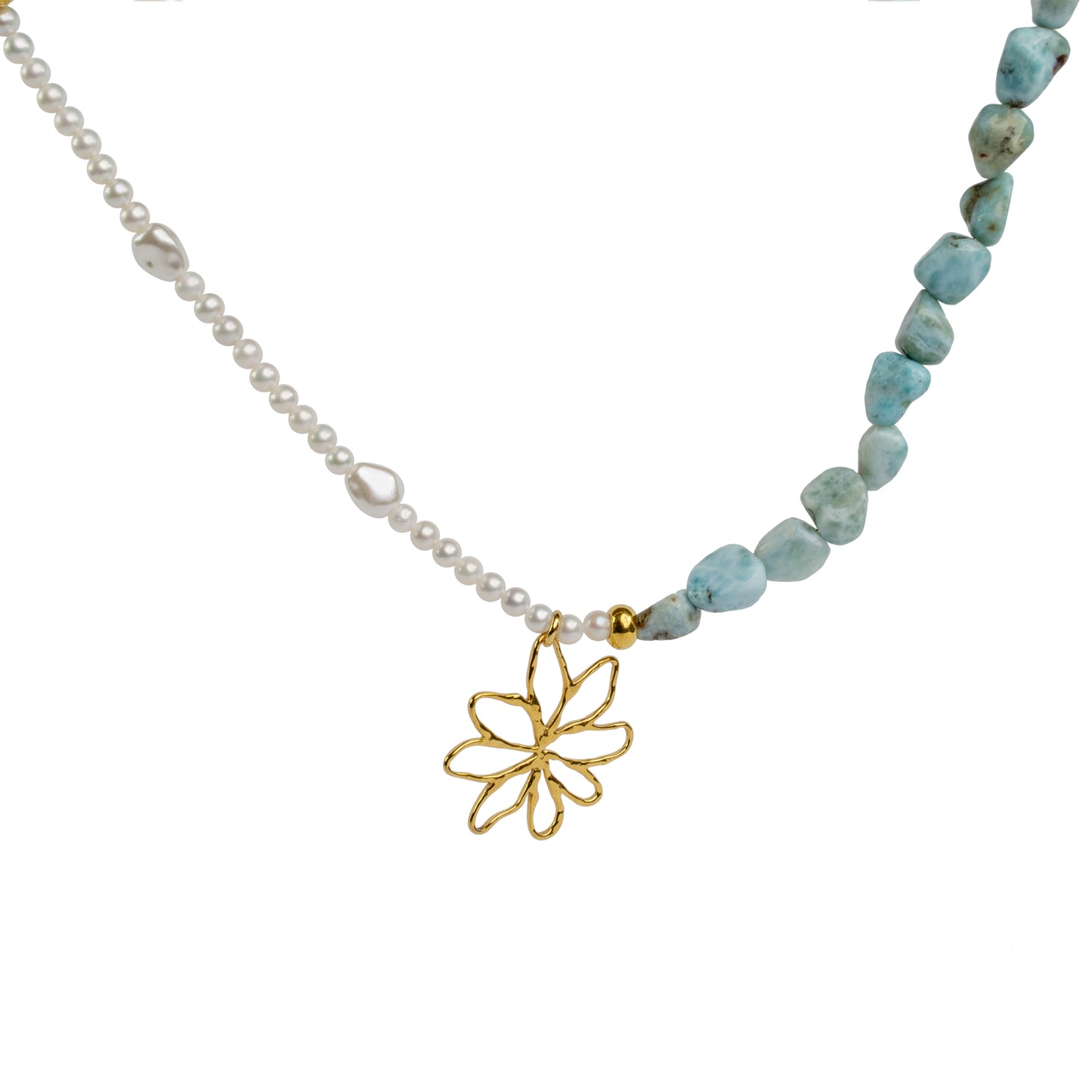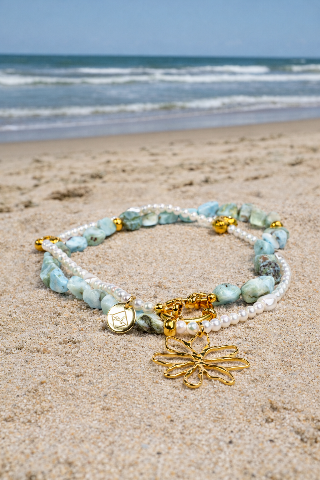 Het sprankelende turkoois brengt frisse, vrije energie, terwijl parels een subtiele elegantie toevoegen die nooit uit de mode raakt.